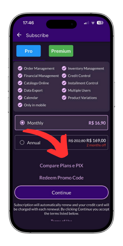To see the payment methods available in your region, in addition to the Google Play Store and the App Store, access the subscription screen and tap Compare plans: