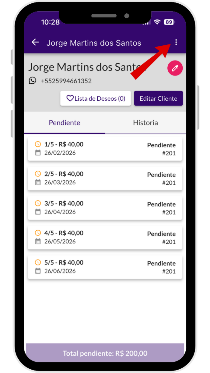 Dentro del perfil del cliente, toca los tres puntos en la esquina