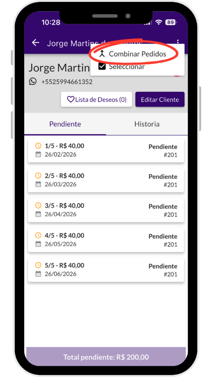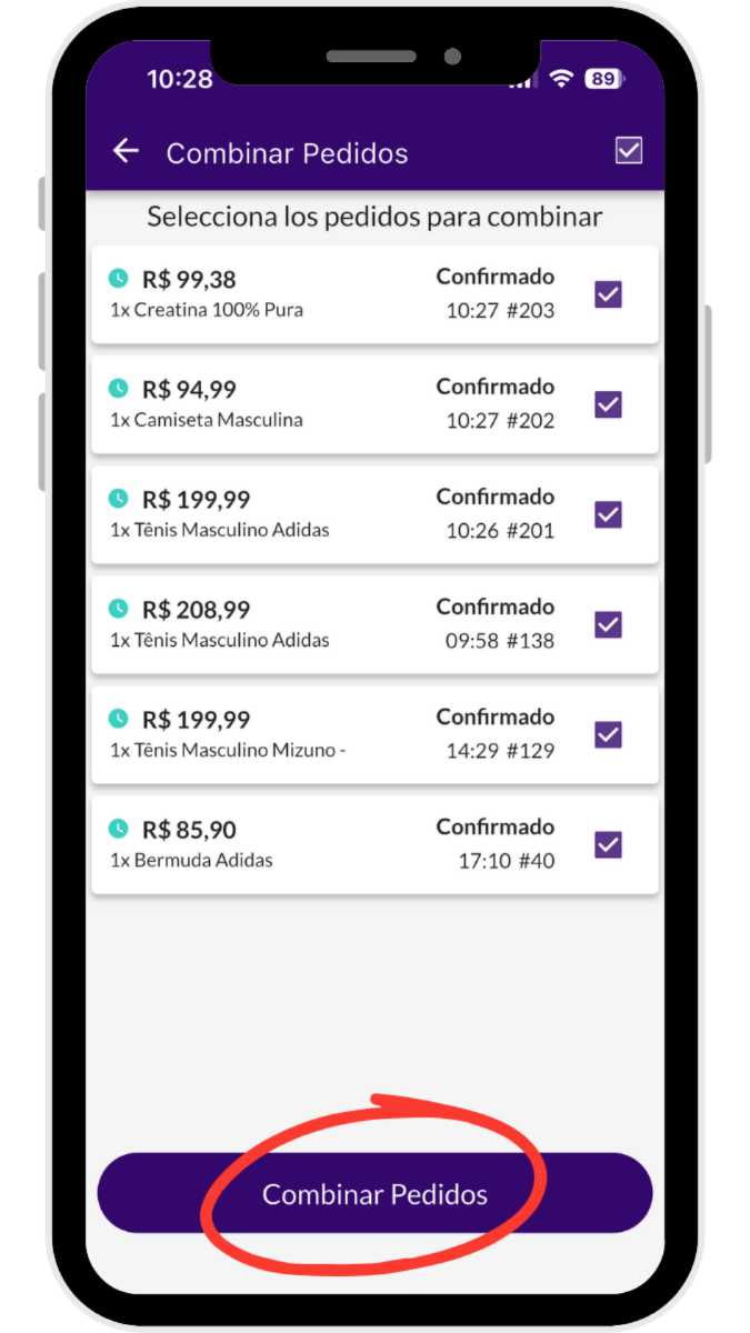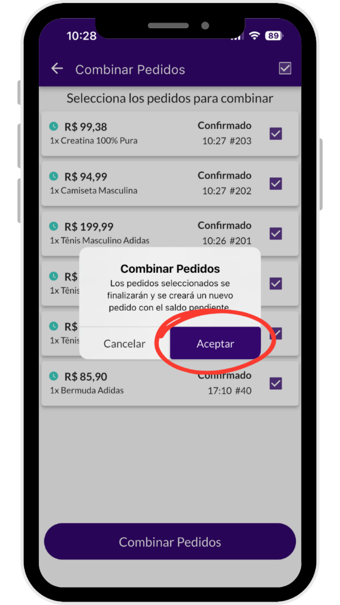 Selecciona todos los pedidos que quieres juntar y luego toca Combinar