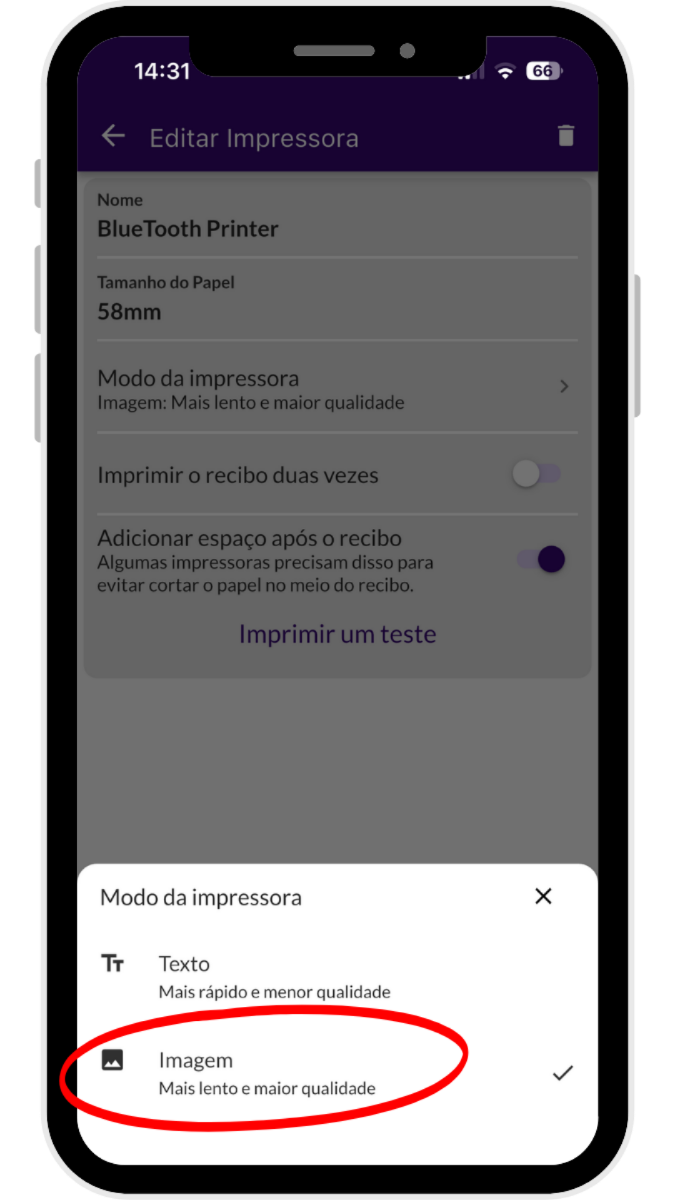modo Imagem, a impressora passa a imprimir o recibo exatamente como ele