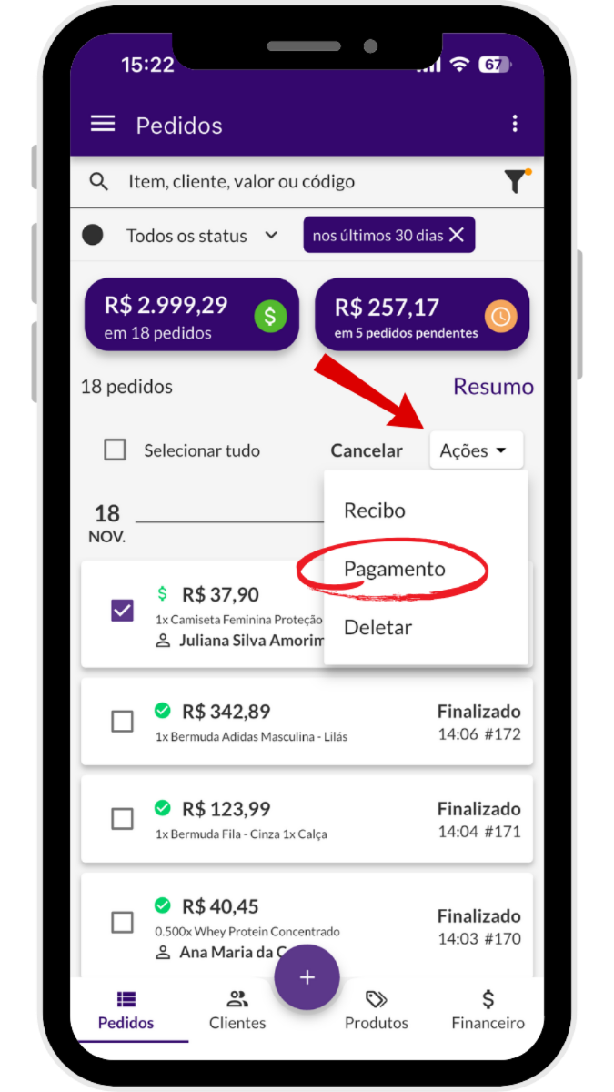 2. Toque no botão “Ações” e depois em “Pagamento”