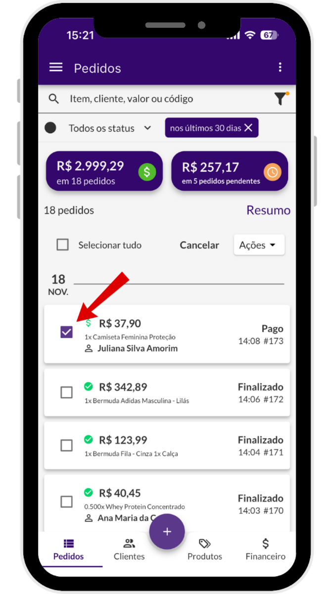 Com os pedidos selecionados, toque no botão Ações. Depois