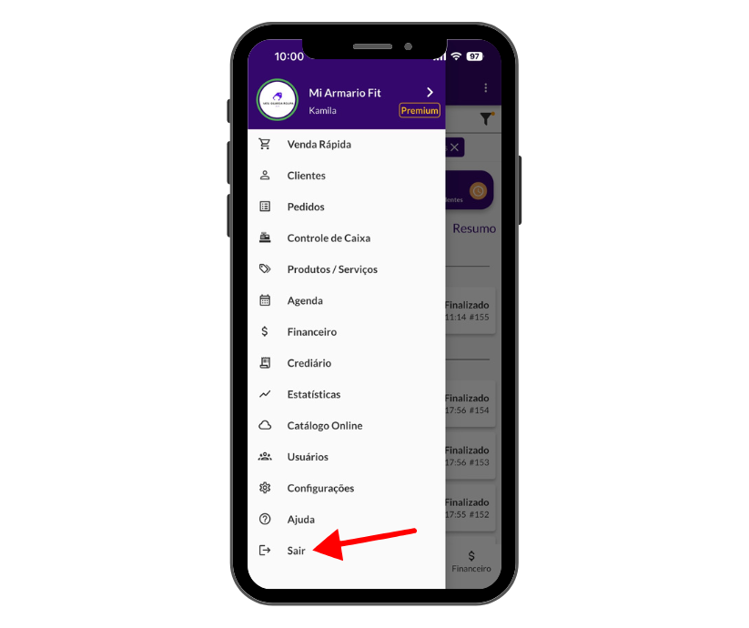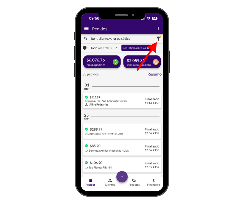Na tela inicial, acesse Pedidos e toque no ícone de filtros