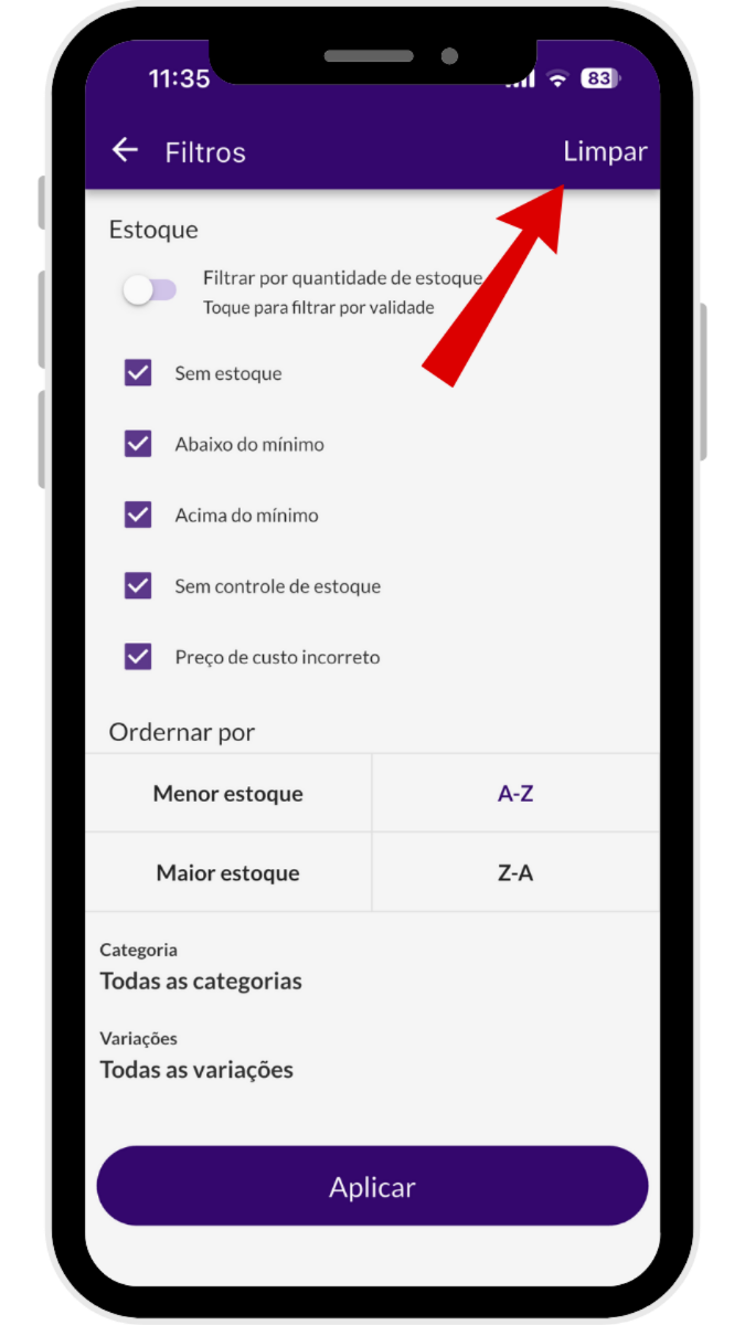 Na tela inicial, vá em Produtos/Serviços, toque em Estoque